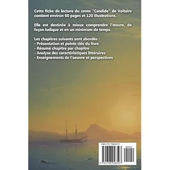 Cette fiche de lecture du conte philosophique "Candide" contient environ 65 pages et plus de 120 illustrations pour aider à la compréhension du texte et bien enregistrer les informations en vue d'un examen. Les informations sont condensées : en une heure de lecture, vous pourrez saisir l'essentiel du conte de Voltaire.Notre ouvrage est écrit par un enseignant en français.Les chapitres suivants sont abordés :- Biographie de l'auteur : récit détaillé et illustré de la vie de Voltaire (sa jeunesse, ses exils, ses succès et difficultés)- Contexte de l'œuvre : contexte intellectuel et philosophique (les Lumières), contexte politique et détails biographiques (séisme de Lisbonne et Guerre de Sept Ans ; décès de Mme du Châtelet)- Présentation du conte : origines (inspiration de Rabelais), caractéristiques (références à l'actualité, réflexions, détails biographiques...), structure (le départ d'Europe, le pays d'Eldorado, le retour vers le vieux continent)- Personnages principaux et secondaires (21 personnages mentionnés, avec 23 images pour bien les retenir)- Résumé illustré, chapitre par chapitre (chacun des 30 chapitres est résumé en détail, avec plus de 60 images et dessins).- Aspects littéraires de l'oeuvre : les caractéristiques du conte sont explicitées (le choix du conte, le conte "réaliste" et satirique, l'apologue, des éléments du roman d'apprentissage, une écriture sobre et limpide, un style imagé et exotique, une parodie des romans sentimentaux, des rebondissements nombreux et invraisemblables, une aventure grotesque, humoristique et licencieuse)- Aspects philosophiques de l'oeuvre : Candide ou le combat de Voltaire contre l'optimisme de Leibniz (explication de la doctrine de Leibniz, et pourquoi Voltaire l'a combattue)- Autres thèmes abordés dans l'oeuvre : sur le champ des idées (la noirceur de l'être humain, religion et fanatisme, Dieu et la providence, l'utopie d'Eldorado et ses enseignements, la quête de l'homme vers le bonheur, l'amour de la vie malgré tout, philosophie : bonne et mauvaise attitude) et des faits (la colonisation dénoncée, critique des scientifiques ridicules, le fléau de l'ennui, les bienfaits du travail, les vertus du voyage, le temps et ses ravages, critique de la guerre, le mal de la politique, critique de la cour royale, la cruauté de l'esclavage, l'importance de la nature)- Perspectives contemporaines : illustration d'une problématique de Candide dans notre vie quotidienne.Cette fiche est ainsi destinée à mieux interpréter le roman, de façon ludique, en peu de temps. Les illustrations vous aideront à mémoriser les informations. Idéal pour le bac français mais aussi pour les collégiens d'un très bon niveau.
